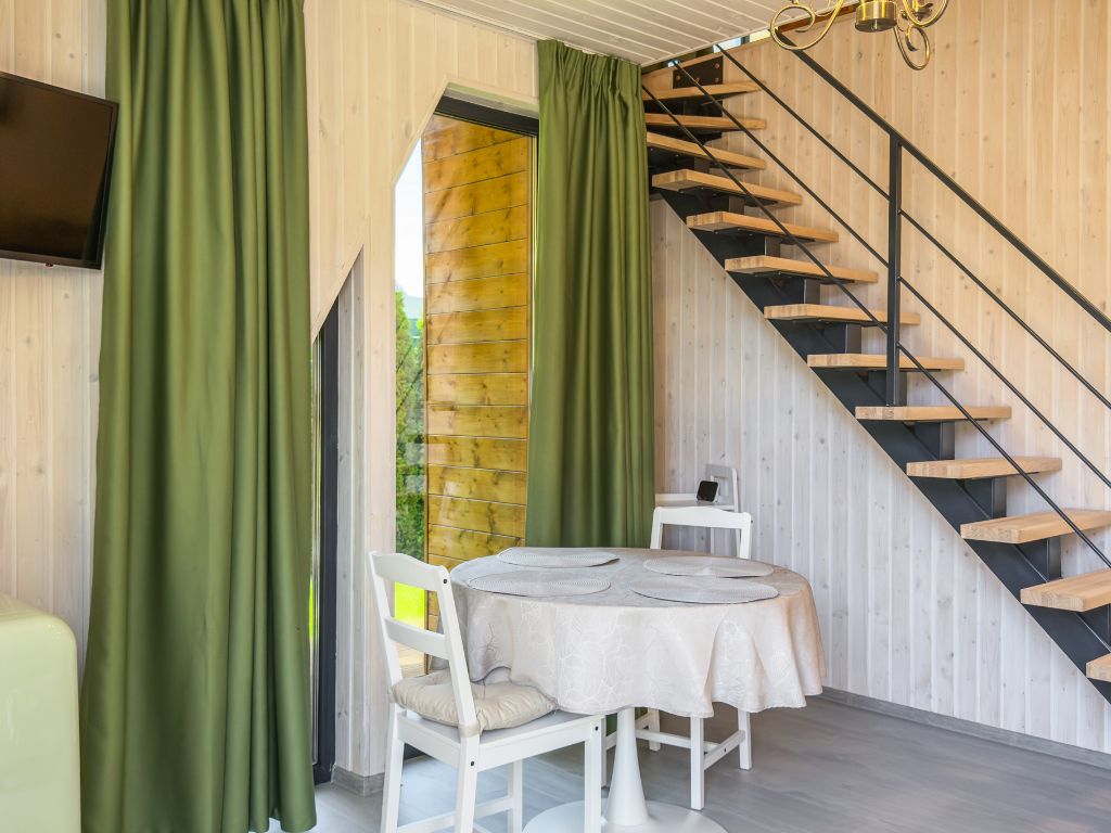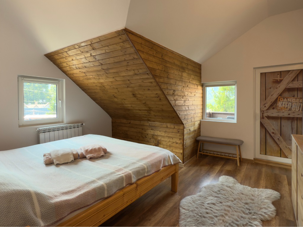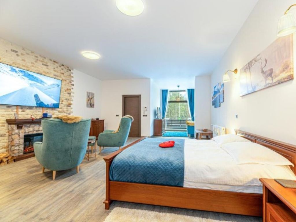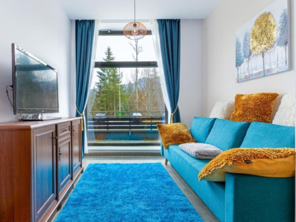 Spațiul include o zonă de dormit, o canapea extensibilă și o zona de relaxare, toate într-o atmosferă elegantă. Bucătăria complet utilată cu loc de luat masa și baia modernă oferă confortul necesar pentru o ședere relaxantă, iar peretele vitrat dezvăluie peisaje montane minunate, adăugând un farmec special vacanței.